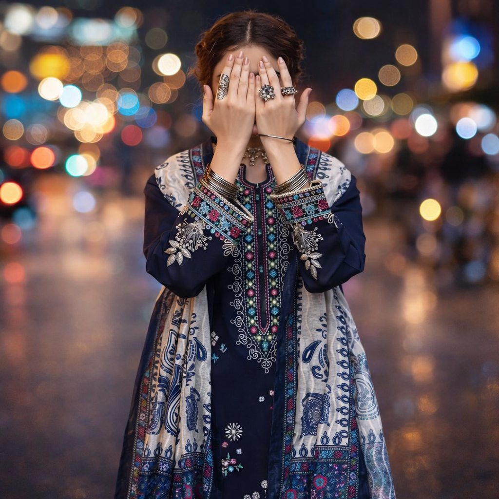 Paired with an embroidered Dhanak trouser and a digitally printed wool shawl, this suit is a perfect choice for winter wear, offering comfort, sophistication, and versatility for daily wear or casual gatherings.