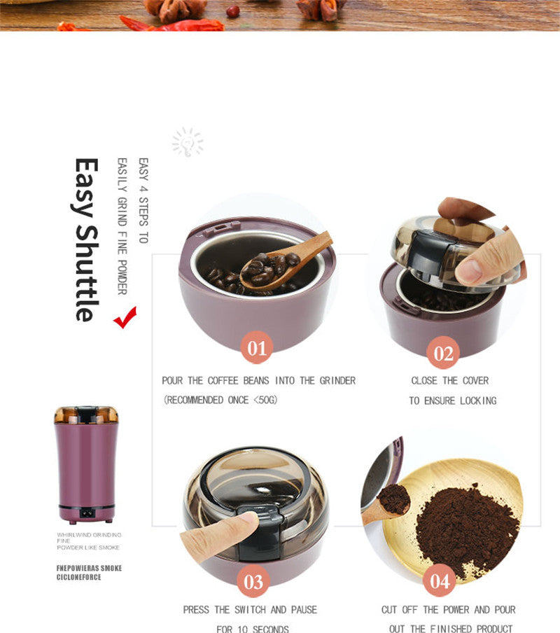 Bring convenience and style to your kitchen with this powerful yet compact electric grinder. Designed for everyday use, it easily grinds both hard and soft ingredients – from coffee beans to spices, herbs, sugar, and more. A perfect gift for food lovers, coffee addicts, or anyone who enjoys fresh, homemade blends.