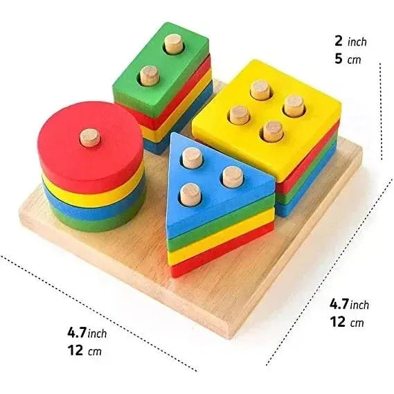 - It includes 4 different shapes each 4 colorsblock. Pegs from 1-4. Using the shape outlines on the board, children can match the pieces to the outlines and stack them on the pegs.