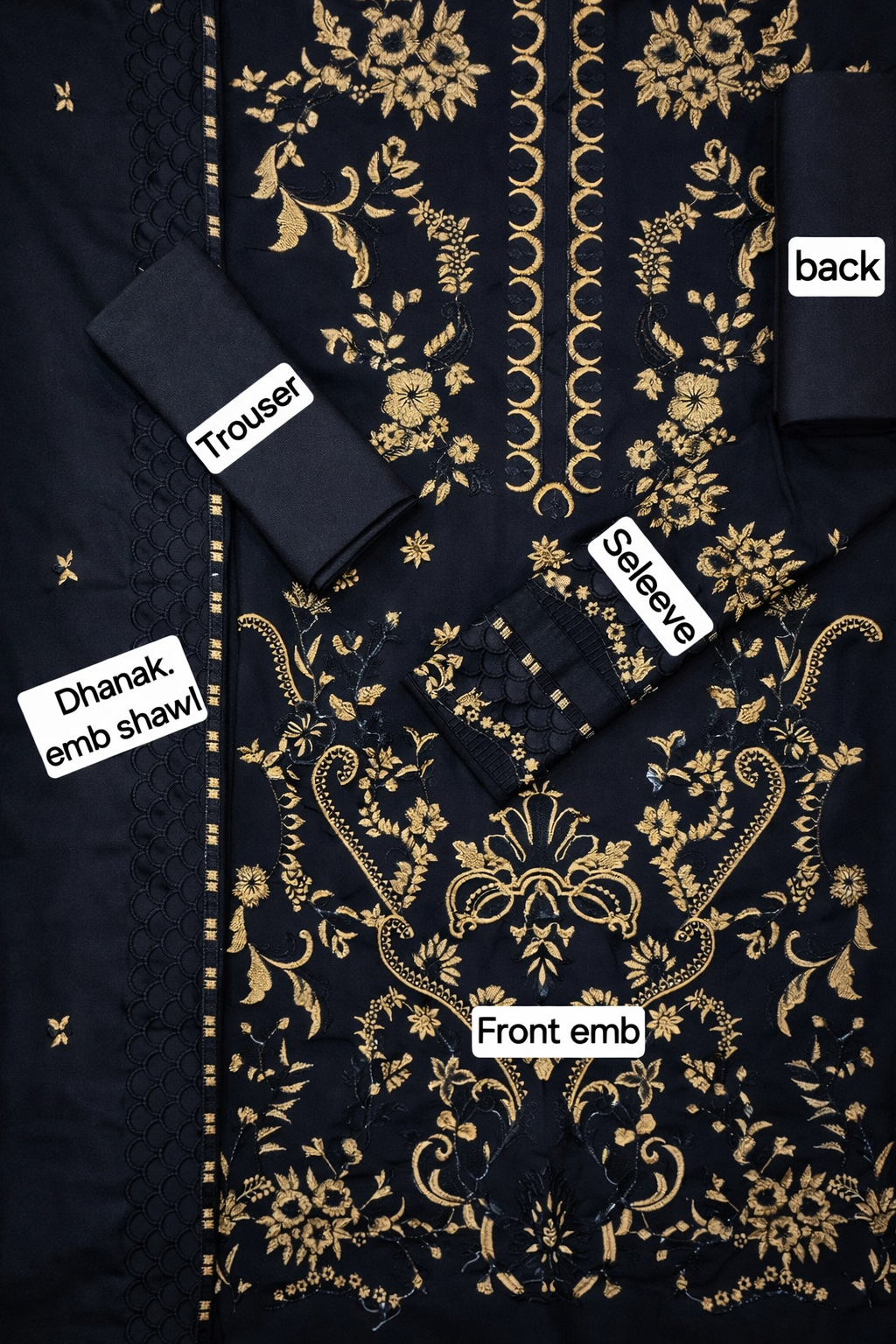 unstitched suitElevate your winter wardrobe with this elegant 3-piece embroidered Dhanak suit. Featuring full embroidery on the shirt front, daman patchwork, and sleeves, it comes with a plain dyed trouser (with embroidered patch) and an embroidered Dhanak dupatta. Designed with premium fabric, neat finishing, and timeless embroidery, this outfit is perfect for both formal gatherings and seasonal wear.