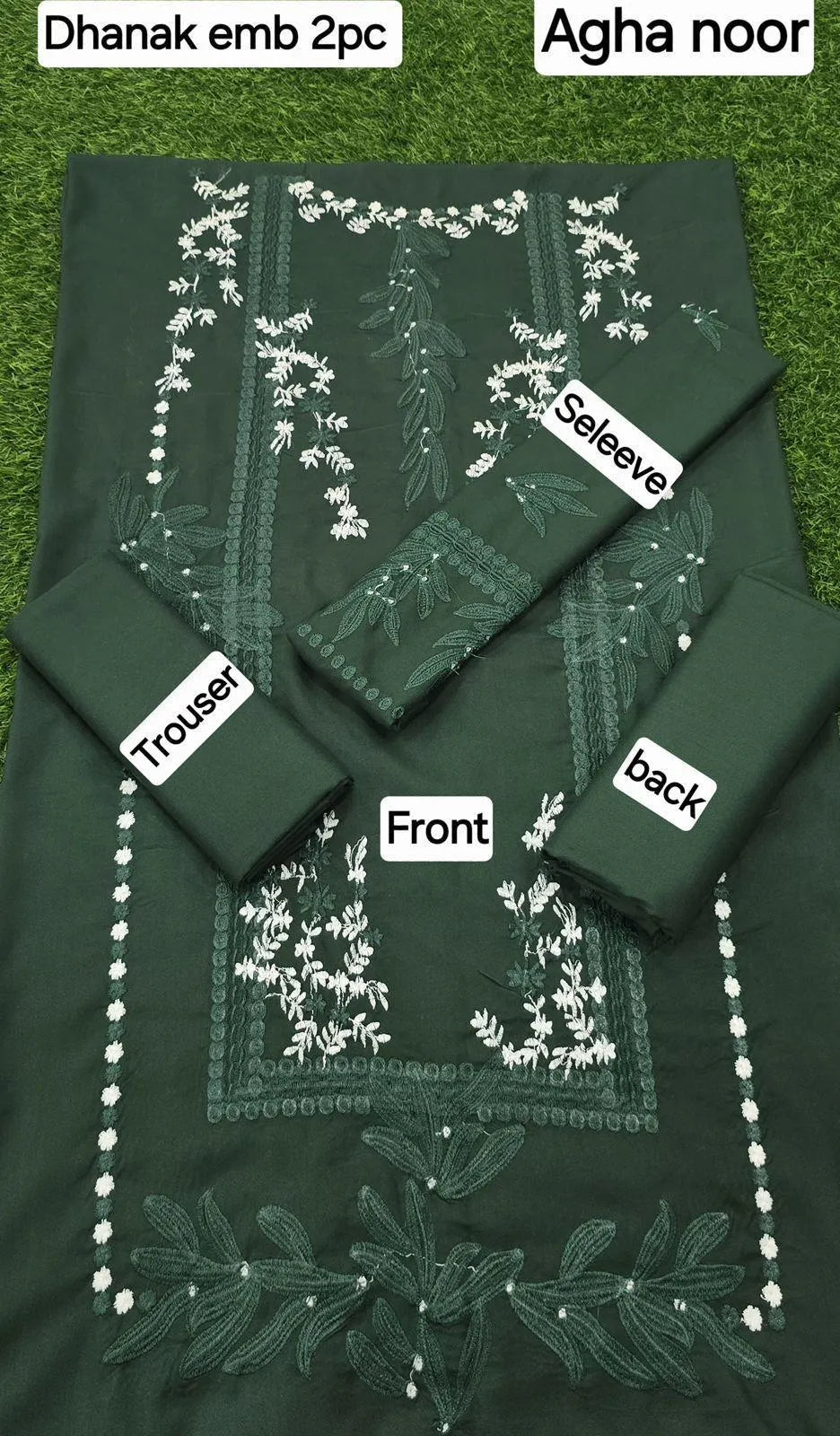 Elevate your wardrobe with this stunning green embroidered suit set, crafted from premium Dhanak fabric. This 2-piece ensemble features an intricately embroidered shirt front paired with a plain trouser, offering the perfect balance of elegance and comfort. Ideal for festive gatherings or special occasions, this outfit is designed to make you look effortlessly chic.