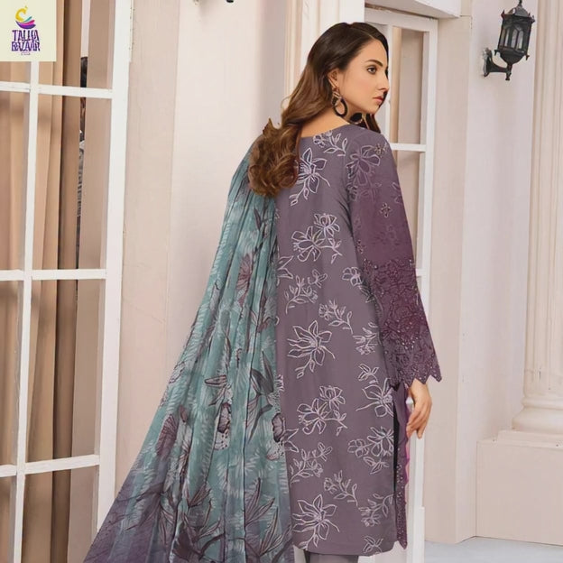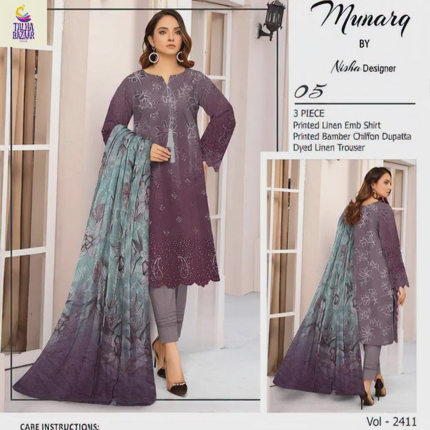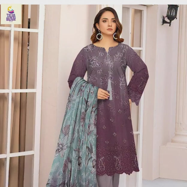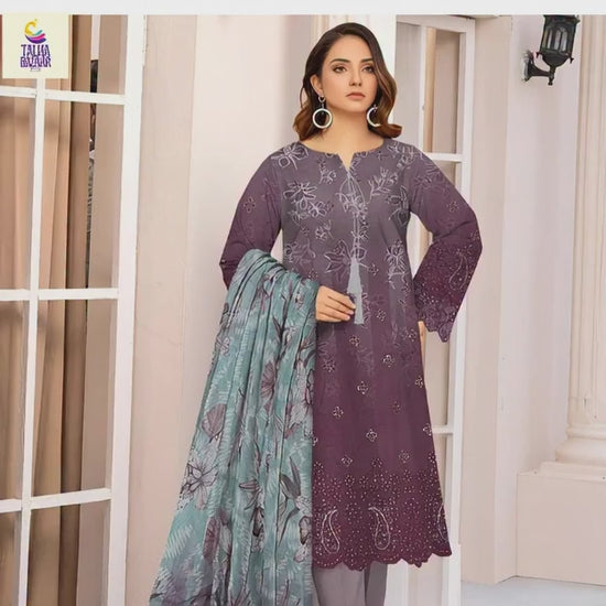 Embrace sophistication with this stunning purple linen suit, featuring exquisite printed and embroidered designs. The delicately chikankari embroidered sleeves and cut work daman bring refined elegance to your wardrobe. Perfect for festive occasions and winter gatherings, this three-piece ensemble offers comfort, style, and premium craftsmanship.