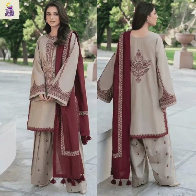 Crafted from premium Airjet Dhanak fabric, it features a luxurious embroidered neckline, cut-work sleeves, and digital prints that bring festive charm to your wardrobe. The embroidered trouser patch and bordered shawl-style dupatta enhance its graceful appeal.